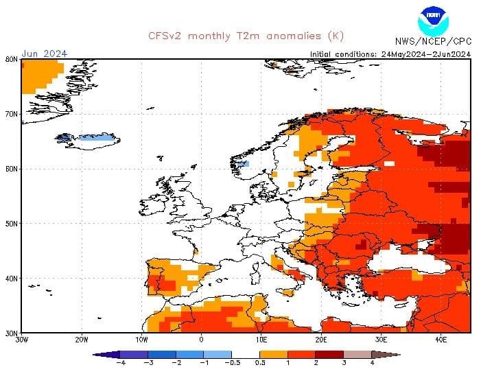 Fordelen med den amerikanske modellen er at den alltid er oppdatert (men den er ikke alltid den mest nøyaktige). Bildet under viser forventet temperaturavvik i juni, i forhold til normalperioden.