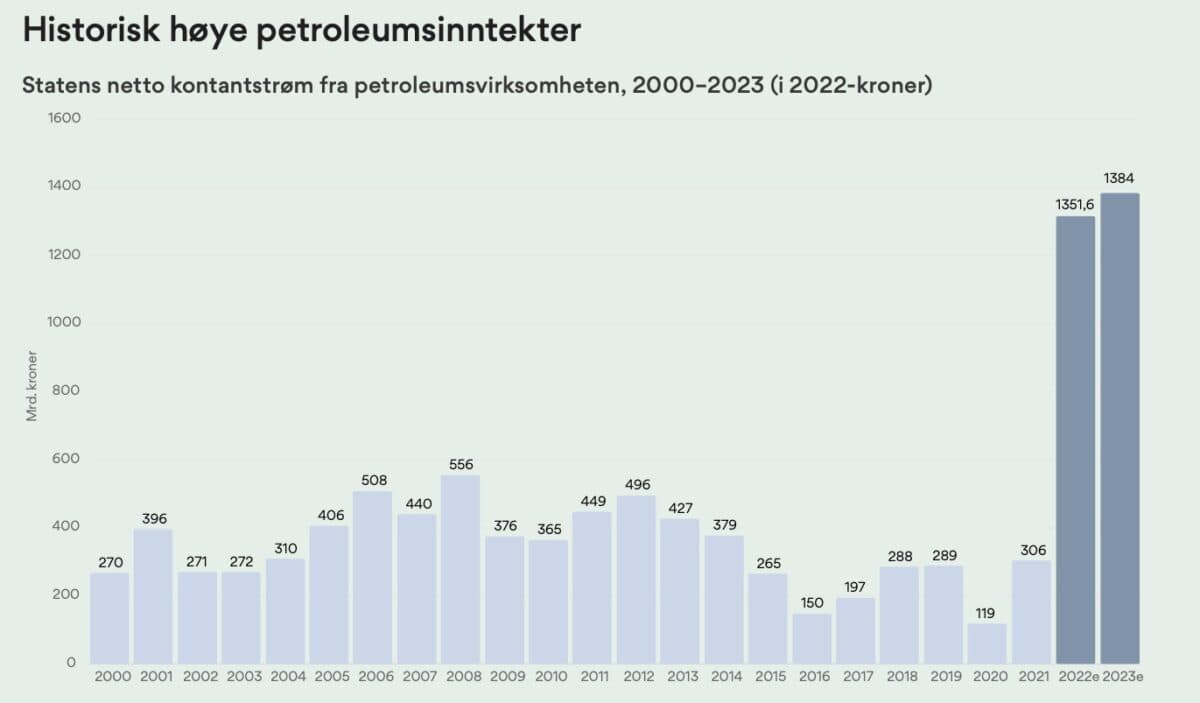 I 2022 og 2023 er statens inntekter frå olje og gass venta å auke til høvesvis 1 300 og 1400 milliardar kroner – opp frå under 300 milliardar kroner i 2021. Ekstrainntektene manglar sidestykke i norsk historie: Inntektene frå norsk olje- og gassaktivitet har alltid gått opp og ned – men berre to gongar tidlegare har den norske stat tent over 500 milliardar kroner på eit år. Ikkje ein einaste gong i perioden 2015-2020 bikka petroleumsinntektene 300 milliardar kroner.
