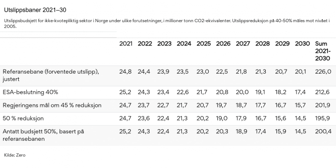 I ZEROs beregning av Norges utslippsbudsjett har vi ikke tatt hensyn til en eventuell endring som kan komme i revideringen av budsjettet i 2025. Når vi ser bort fra en eventuell revidering i 2025, vil budsjettet med et mål på 50 prosent være om lag 6 Mt lavere enn budsjettet som er lagt til grunn i klimameldingen.