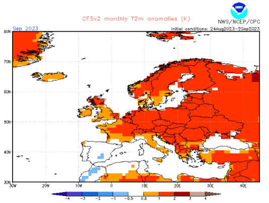 Dersom du klikker på kartet, kan du bla deg fremover i tid, men husk at treffsikkerheten faller raskt. Per i dag er det en liten overvekt av varme prognoser. Dette støttes også av de mest oppdaterte prognosene med den amerikanske modellen CFSv2. Kartet under viser prognosen for gjennomsnittlig temperatur i september, i form av avvik fra normalen.