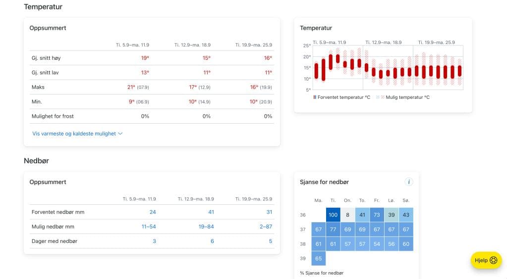 Vi har derimot gleden av å presentere en ny varslingstjeneste fra Meteorologisk institutt og NRK. Deres 21-dagersvarsel er utviklet som en del av forskningen i Climate Futures. Foreløpig er tjenesten kun tilgjengelig på beta.yr.no, men de ønsker seg tilbakemelding på hvordan tjenesten oppleves. Basert på disse vil de endre tjenesten før den lanseres på den vanlige Yr-plattformen. Del gjerne dine erfaringer med dem!