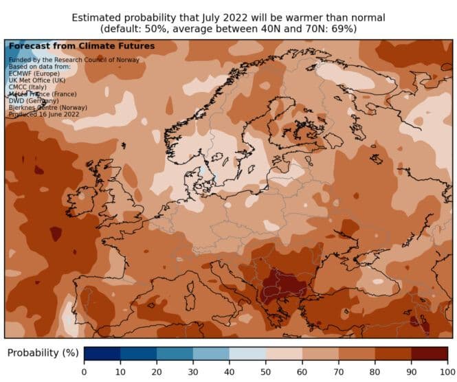 Det varsles høyere temperaturer enn gjennomsnittet for referanseperioden i hele Europa. Dette er helt som forventet, ettersom den sterke oppvarmingen i løpet av perioden gjør at det er langt mer sannsynlig at en julimåned i 2022 er varmere enn normalt enn at en julimåned i 1993 var det. Dersom vi hadde valgt en kortere referanseperiode, for eksempel kun de siste ti årene, ville sannsynligheten ha vært lavere de fleste steder.