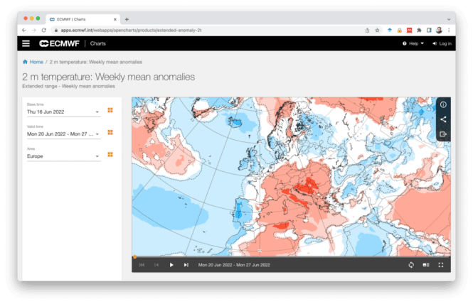 Foreløpig ser det altså mer sannsynlig ut at august blir varmere enn normalt enn at juli blir det. Mye kan forandre seg etter hvert. Det er mulig å følge med på utviklingen i månedsvarslene selv ved å se på oppdaterte kart fra ECMWF her. Der kan du for eksempel klikke på «2 m temperature: Weekly mean anomalies». Da får du varsler for temperaturen de neste ukene ved å navigere med piltastene: