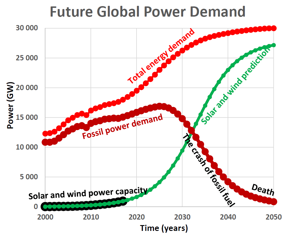 Årsaken til det drastiske fallet i global etterspørsel etter fossilt brensel er den pågående eksponentielle utnyttelsen av sol- og vindenergi (grønn kurve). Denne vil fortsette, ikke minst grunnet den synkende og konkurransedyktige prisen, som er omtrent lik for solceller og landbaserte vindturbiner og ligger nå i 2019 på rundt 40 øre pr. kilowattime (kWh).