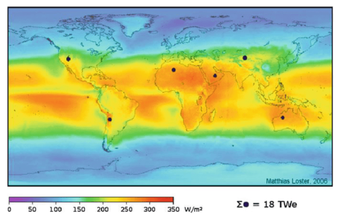 18000 GW tilsvarer omtrent dagens globale energibehov. Selv om prikkene i kartet (figur 3) er små, er det snakk om ganske store områder. Likeledes krever vindturbiner vesentlige areal. Dette kan oppnås ved å avsette en del store og/eller mange mindre land-/havområder for massiv kraftproduksjon, og sammen med det vi kan produsere på egne hustak, direkte solvarmeutnyttelse etc., vil vi kunne fylle det totale kraftbehovet med ren energi i 2050. Dette vil noen steder forhindres av lokal politikk, mens det andre steder, spesielt i u-land, vil kunne være kjærkommen industriutvikling som vil kunne løfte folk ut av fattigdom.