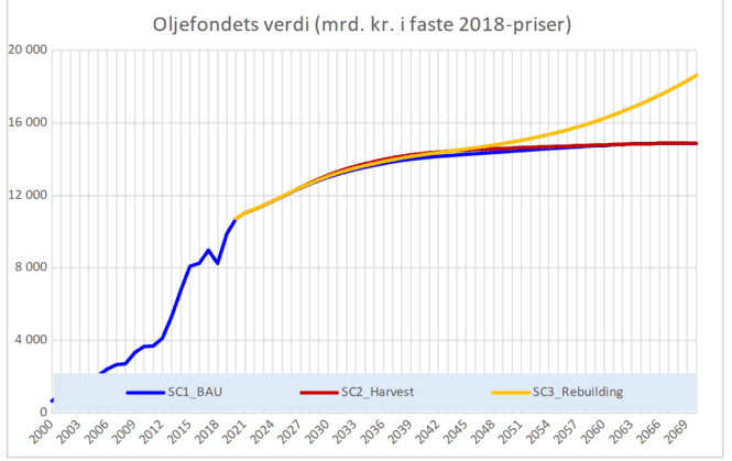 Vi undersøker tre scenarier for offshore energinæringer til 2070: Først «Business as usual» hvor gjeldende trender og dagens offisielle planer videreføres. Så «Høsting» hvor statens kontantstrøm maksimeres ved å høste (tømme) eksisterende felt, men med raskt synkende investeringer i ny kapasitet. Deretter «Gjenoppbygging», hvor høstingen kombineres med moderate investeringer i nye offshore lavkarbon-energiprodukter, spesielt havvind for eksport.