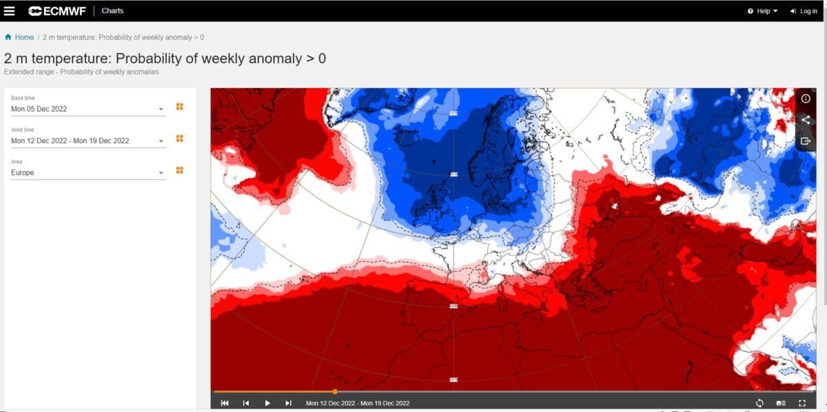 Under viser vi en skjermdump av de nyeste prognosene for sannsynligheten for at de neste ukene blir varmere enn normalt, der bildet kun viser kommende uke, altså den som starter 12. desember, men ved å klikke på bildet kan du selv navigere fremover i tid ved å bruke piltastene.