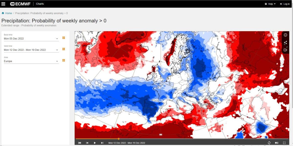 Mange er sikkert også interessert i nedbøren. Hvis det skal bli hvit jul, trenger vi snø. Bildet under viser sannsynligheten for at det skal komme mer nedbør enn normalt neste uke, der røde farger viser områder der denne sannsynligheten er lav. Det ser ut til å bli tørt langs kysten i vest og nord. Klikk på bildet for å spole frem i tid.