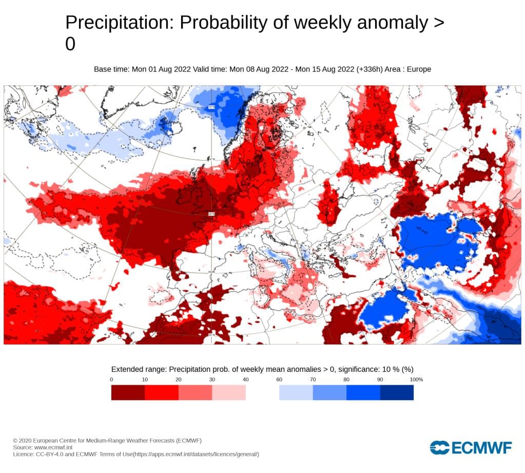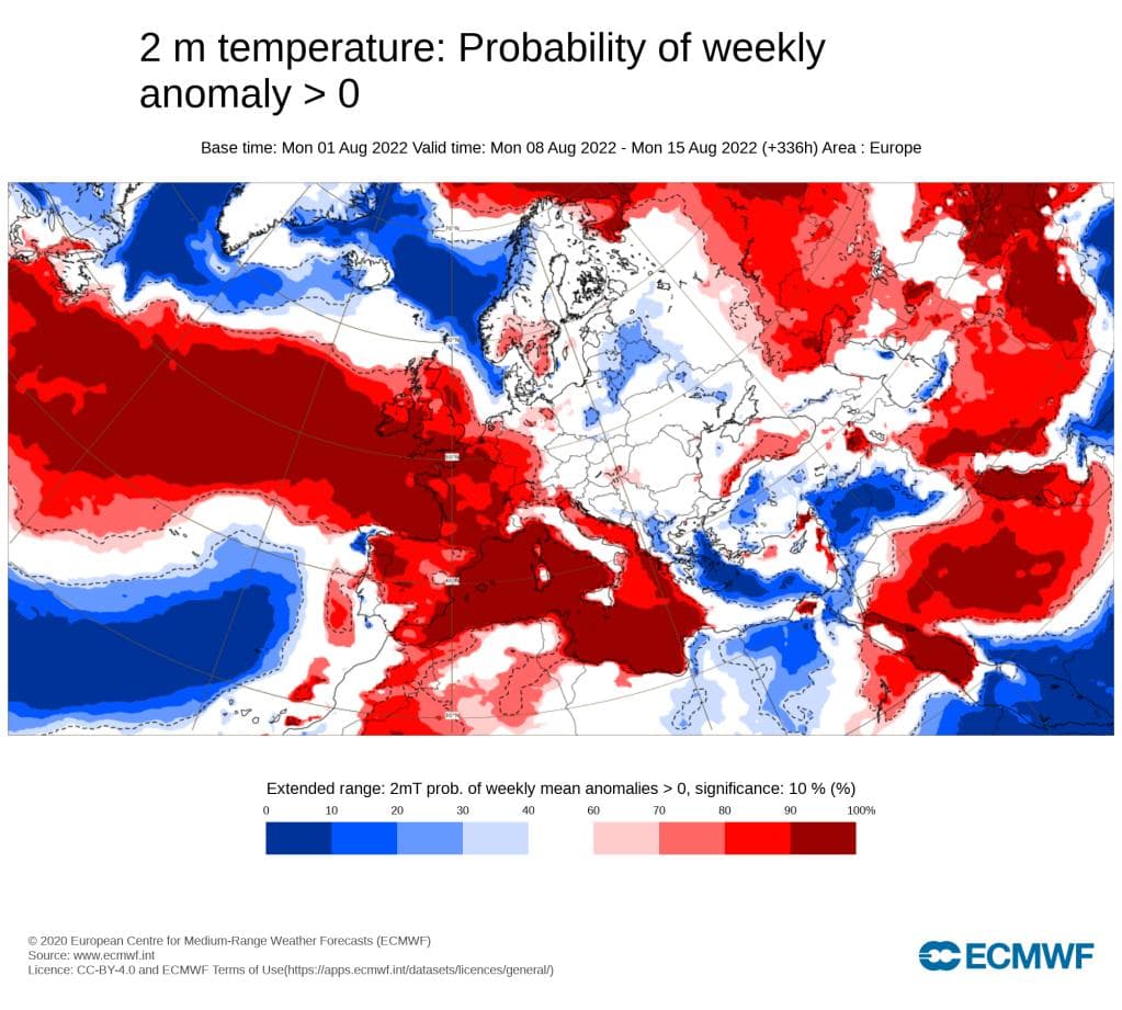 NCEP sin modell indikerer altså også at det kan bli vått i nord og tørt i sør, men husk at slike varsler gjelder for den totale nedbøren for hele måneden. Hvis vi ønsker informasjon om uke for uke, må vi ty til månedsvarslene. Her er ECMWF sin sannsynlighet for at neste uke blir varmere enn normalt: