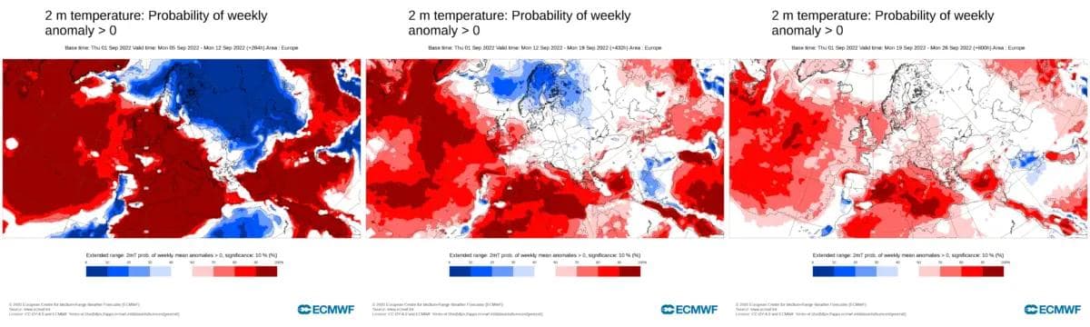Under ser dere noen kart basert på det nyeste månedsvarselet fra ECMWF. Disse viser sannsynligheten for at de neste ukene blir varmere enn normalt. Hvis du ønsker å se flere kart, kan du klikke her for å komme inn på ECMWF sine sider, og der kan du bruke piltastene for å navigere frem og tilbake i tid.