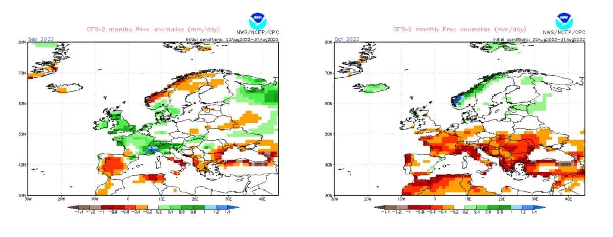 Til slutt tar vi med noen ferske amerikanske prognoser, som er basert på tilstanden i havet og atmosfæren i slutten av august. Under ser vi nedbørsprognosene for hele september og oktober.