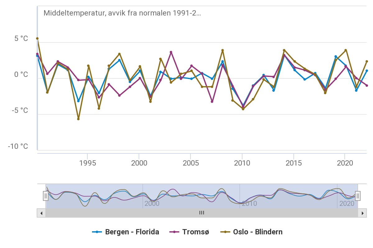 Omtrent hele landet ligger i et område med 50–60 % sannsynlighet for høyere temperaturer enn normalt. Dette er ikke spesielt høyt med tanke på den underliggende oppvarmingstrenden i referanseperioden. Gjennomsnittet for beltet mellom 40 og 70 grader nord globalt er på 63 %. Årsaken til at dette er høyere enn 50 % er at det i utgangspunktet er mer sannsynlig at en måned i 2023 blir varmere enn gjennomsnittet for de siste tiårene enn at en februar for noen tiår siden var det. Dette kan illustreres med Figur 3, som viser temperaturen i februar fra 1990 for de tre stasjonene fra Figur 1, vist som avvik fra normalen 1991–2020. De gule vertikale linjene i Figur 1 viser forventet temperatur i de tre byene i henhold til en lineær oppvarmingstrend.