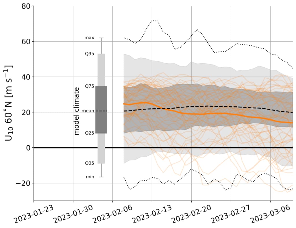 De nyeste varslene for vindhastigheten i stratosfæren ser vi på Figur 5 under. Flere av modellens 51 prognoser gir et sammenbrudd av vindene. Gjennomsnittet av prognosene gir en svakere vind enn normalt fra midten av februar, og det kan bety en reduksjon i antall lavtrykk som treffer kysten vår. Dersom sannsynligheten for dette scenarioet øker, vil vi komme med et oppdatert varsel.