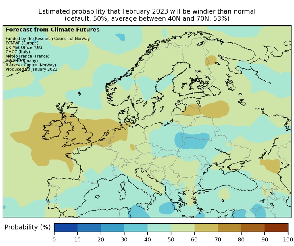 Vinden nede ved bakken er også av interesse, blant annet med tanke på strømprisene. Figur 6 viser sannsynligheten for at det blir sterkere vind enn normalt i februar. Dersom dette slår til, blir det mye vind i de områdene som produserer vindkraft. Det kan i så fall isolert sett bety at det blir billigere å produsere og eksportere kraft til Norge.