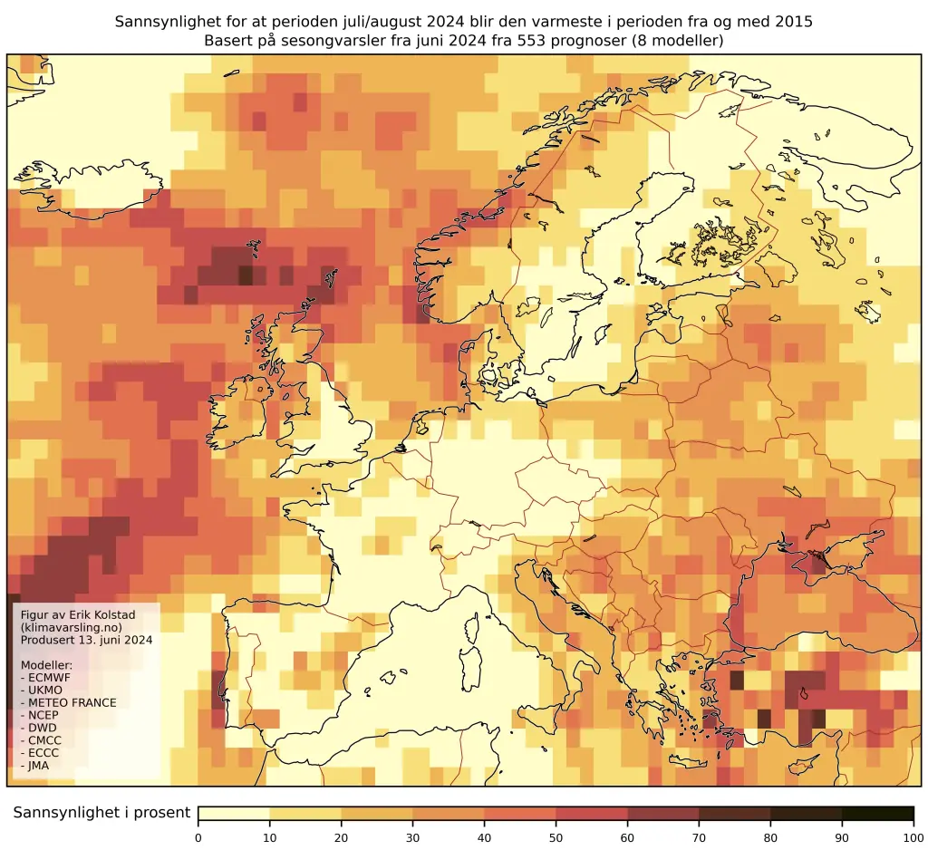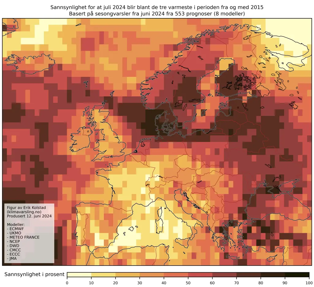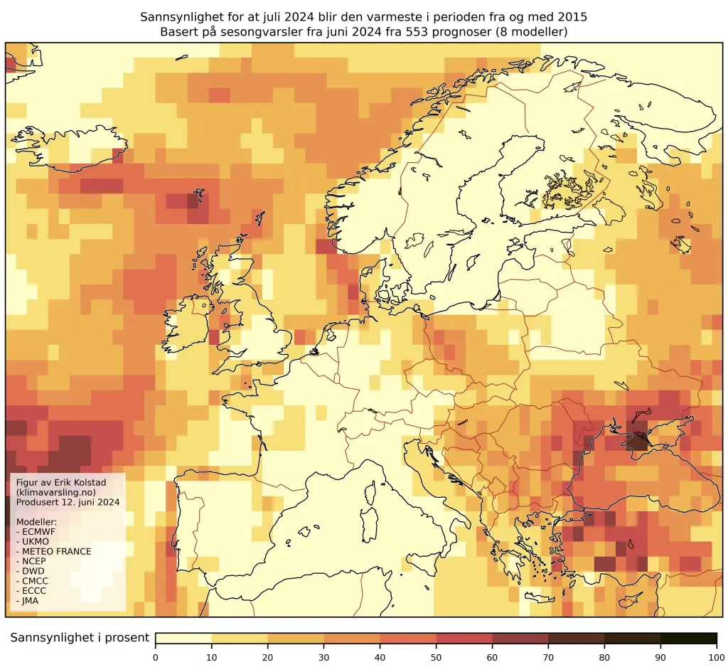 Jeg har samlet 553 prognoser fra totalt åtte modeller denne gangen. Dette er de samme prognosene som brukes av EU sin Copernicus-tjeneste (klikk her for kart og andre produkter). Som i mai brukte jeg prognosene til å regne ut sannsynligheten for at juli kommer til å bli den varmeste juli-måneden i perioden 2015–2024. Rent «statistisk», altså hvis det var helt tilfeldig, ville sannsynligheten ha vært 10 prosent. Her er den beregnete sannsynligheten for Europa: