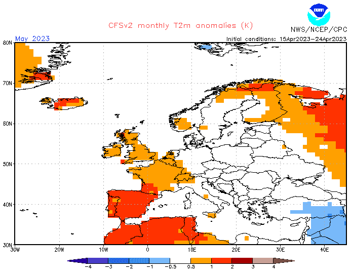 Vi kan også kikke på de siste prognosene fra amerikanske NOAA, denne gang for hele mai under ett. Bildet under viser gjennomsnittlig forventet temperaturavvik fra normalen. Klikk på bildet for å se prognoser for flere måneder frem i tid, men vær obs på at det er økende usikkerhet jo lenger frem prognosene går.