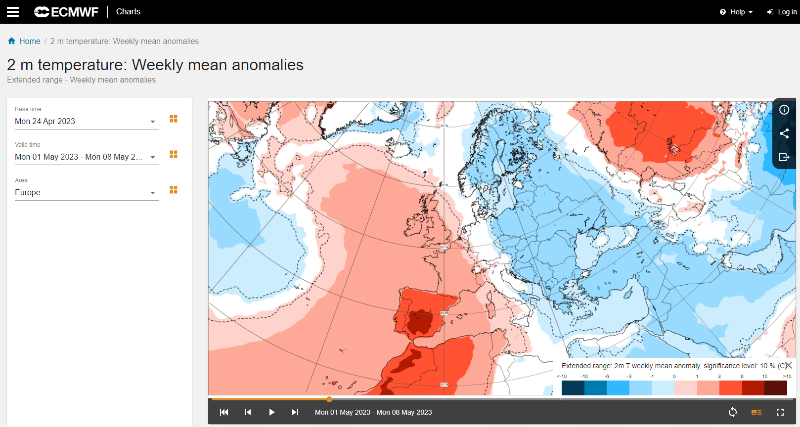 Blå farger indikerer områder med forventet lavere temperaturer enn normalt. Klikk på bildet for å komme til prognosesiden, der du kan navigere frem og tilbake i tid ved hjelp av piltastene.
