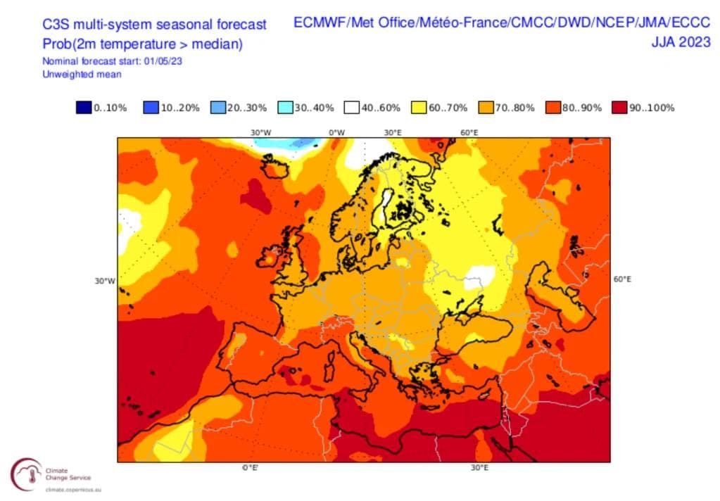 Til slutt ser vi på sommeren under ett, altså hele perioden fra juni til august. Vi har ikke egenproduserte kart for dette, men vi kan se på gratis tilgjengelige kart fra EU sin Copernicus-tjeneste for sesongvarsler. Her kan man velge å se på nær sagt hva man vil. Vi har plukket ut varselet for temperatur, i form av sannsynlighet for at det blir varmere enn normalt i sommer.