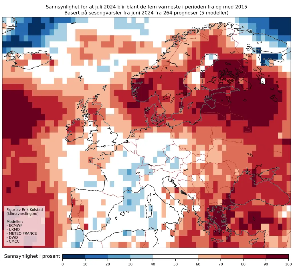 Den 13. juni publiserte jeg et varsel for juli og august, basert på mer enn 500 individuelle prognoser fra åtte ulike modeller (les mer om hvordan disse lages her). På det tidspunktet var det ganske gode sjanser for at juli kom til å bli blant de fem varmeste juli-månedene i perioden 2015–2024. Følgende figur, reprodusert her, viste at sjansen for dette var over 50 prosent mange steder: