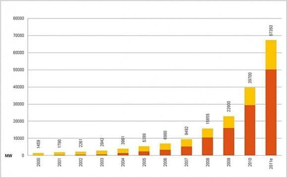 Og solkraften fortsetter å øke i Tyskland. I 2011 ble det installert så mye som 7,6 GW ny solkraft i Tyskland, noe som tilsvarer effekten til seks tyske atomkraftverk.