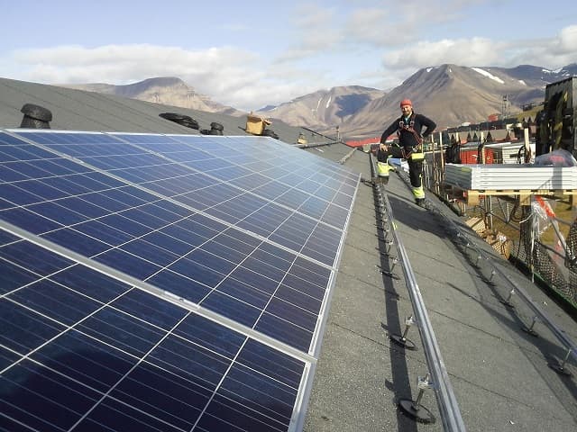 I Longyearbyen på Svalbard står det første solcelleanlegget i Norge som konkurrerer med kraftprisen. Nedbetalingstiden er beregnet til 6 år. (Foto: Solbes AS)