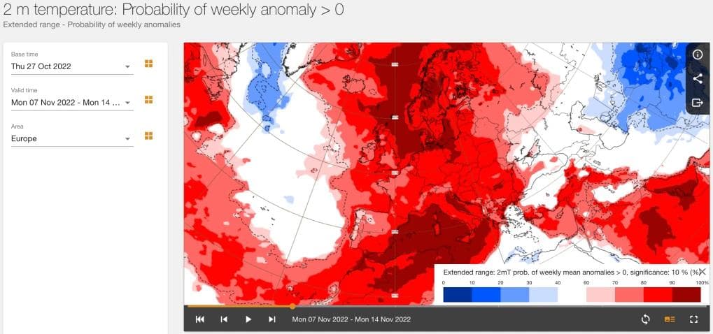 Vi kan først se på temperaturvarselet fra ECMWF. Dette er det europeiske senteret for værvarsling, og det er disse som produserer værvarslene som ligger til grunn for prognosene på både Yr og Storm (selv om de bearbeider dem på ulikt vis før de presenteres). Bildet under viser beregnet sannsynlighet for at den andre uken i november blir varmere enn normalt.
