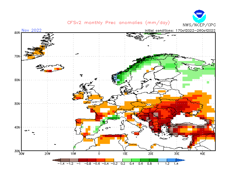 Her er en kort oppdatering av varselet vårt for november, som var basert på sesongvarsler produsert i starten av oktober. Varslene vi presenterer under er produsert i går (27. oktober), så de inneholder mer oppdatert informasjon. Til gjengjeld presenterer vi kun data fra to modeller, mens sesongvarselet var basert på data fra fem modeller.