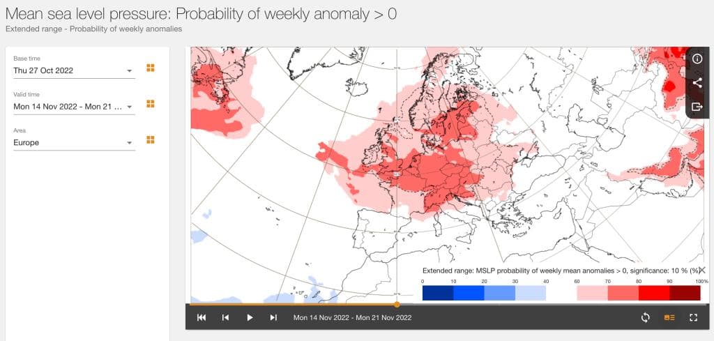 Hvis det blir så vått som den amerikanske modellen «tror», må det være fordi det kommer inn mange lavtrykk som bringer med seg mild og våt luft fra Nord-Atlanteren. Det er imidlertid noen indikasjoner på at det kan dannes noen høytrykk over Nord-Europa. Bildet under viser sannsynligheten for at lufttrykket blir høyere enn normalt den uken som begynner 14. november, ifølge ECMWF sine nyeste langtidsvarsler (klikk på bildet for å navigere frem og tilbake i tid).