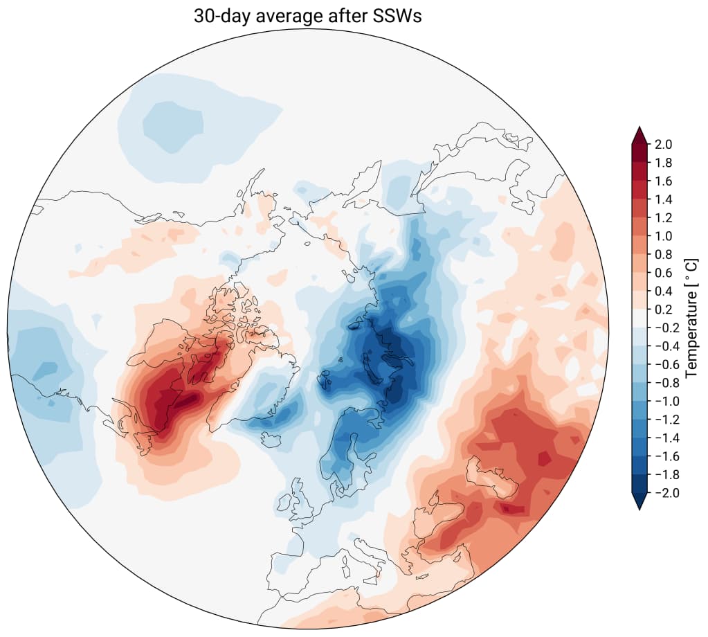 Hvorfor er det så mye snakk om disse oppvarmingene? Jo, perioden etter slike oppvarminger følger ofte et typisk mønster. Her er den gjennomsnittlige temperaturen i de første 60 dagene etter slike oppvarminger: