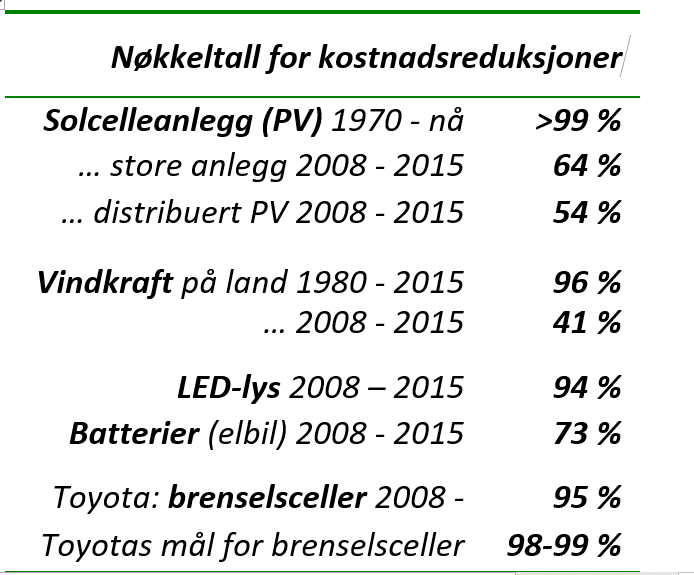 Den store energirevolusjonen har gitt imponerende kostnadsreduksjoner (se tabellen).