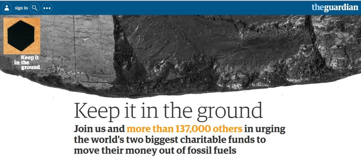 Tirsdag lanserte The Guardian kampanjen «Keep it in the ground» der det uttalte målet er å få to av verdens store fonds, The Wellcome Trust, med en forvaltningskapital på 200 milliarder kroner og The Bill and Melinda Gates Foundation med om lag 350 milliarder kroner, til å trekke seg ut av kull-, gass- og oljeselskap.