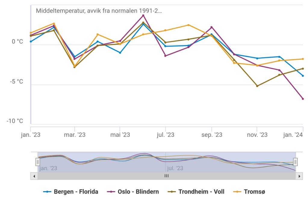 Vi er bare halvveis i januar, så mye kan bli hentet inn av det varslete mildværet, men så langt er Oslo 6,8 grader kaldere enn normalt. Det mest interessante er at alle månedene fra og med oktober i fjor har vært kalde med tanke på årstiden.