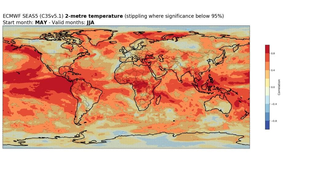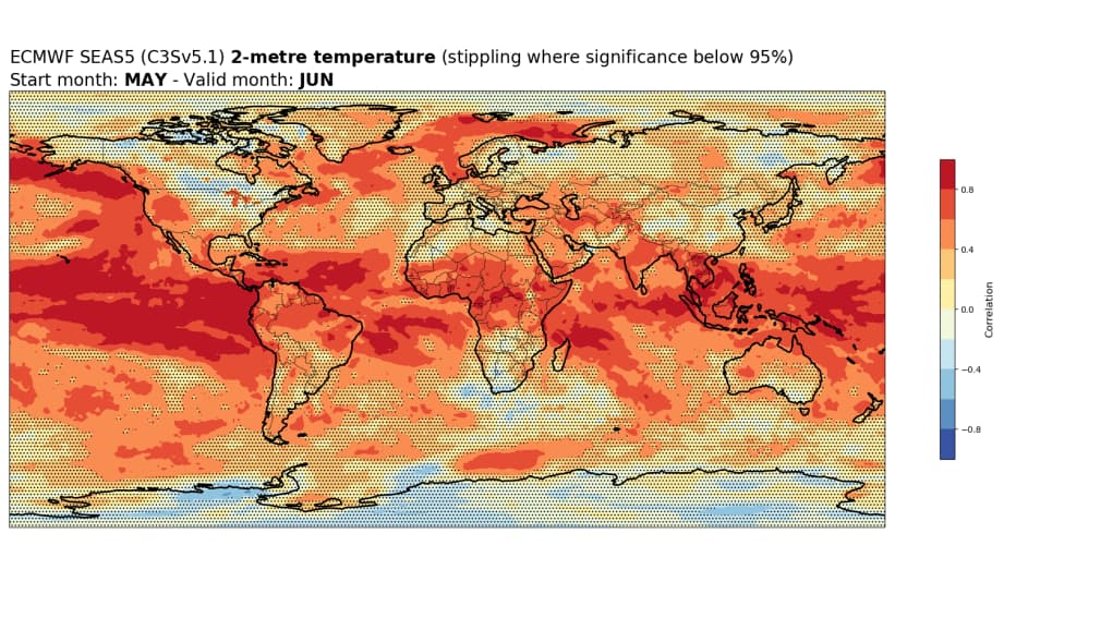 Før vi ser på varslene, må vi presisere at usikkerheten er svært høy for sesongvarsler om sommeren. Kartet under viser hvor ECMWF sin sesongvarslingsmodell – som er den vi bruker i dette innlegget – gjør en god jobb i mai med å varsle temperaturen i juni. Prikkene indikerer områder der modellene ikke er signifikant bedre enn en kvalifisert gjetning basert på klimanormaler.