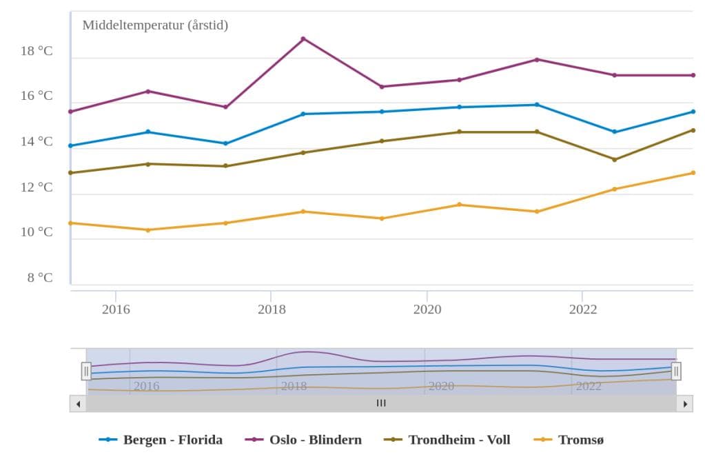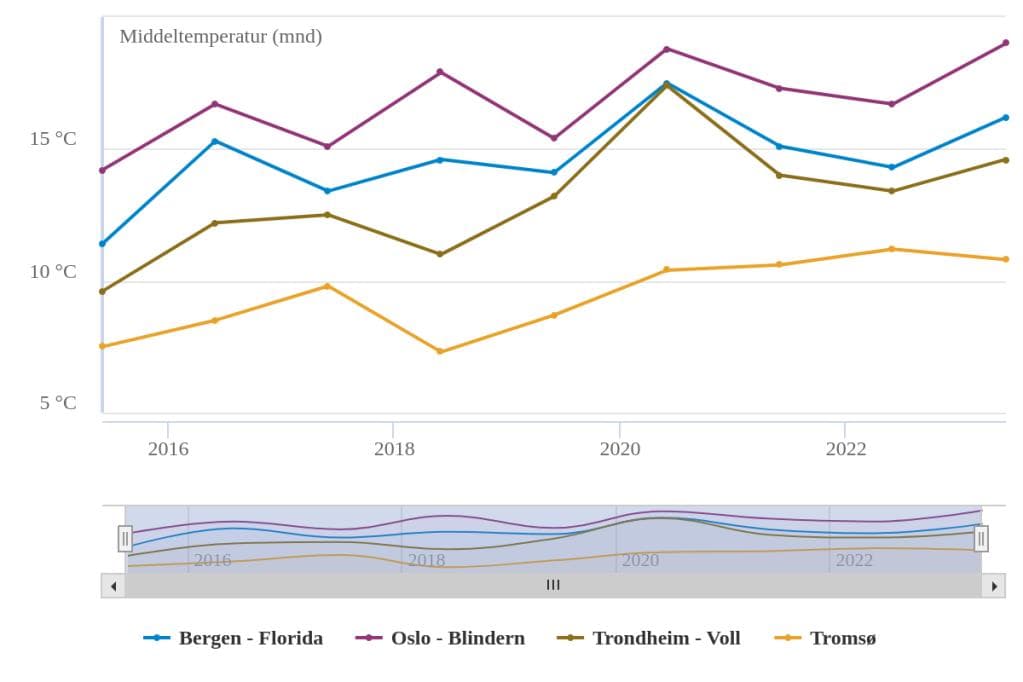 Mange husker 2018 som en varm sommer, som blant annet brakte med seg tørkeproblematikk, men det er kun i Oslo at denne sommeren troner øverst. Det gjør den til gjengjeld med god margin. I Bergen var det 2021 som var varmest, mens både Trondheim og Tromsø hadde sine varmeste somre i fjor. For Tromsø sin del var 2023 den varmeste sommeren i løpet av de siste hundre år.