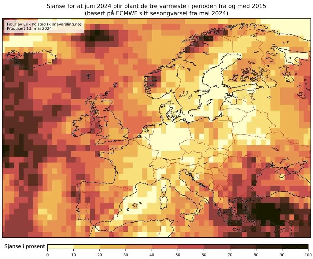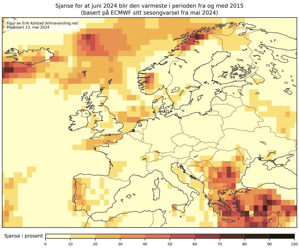 Under viser vi et kart som viser beregnet sannsynlighet for at juni 2024 blir varmere enn alle årene fra og med 2015. Rent statistisk (uten hensyn til de faktiske forholdene) er denne sannsynligheten 10 prosent.