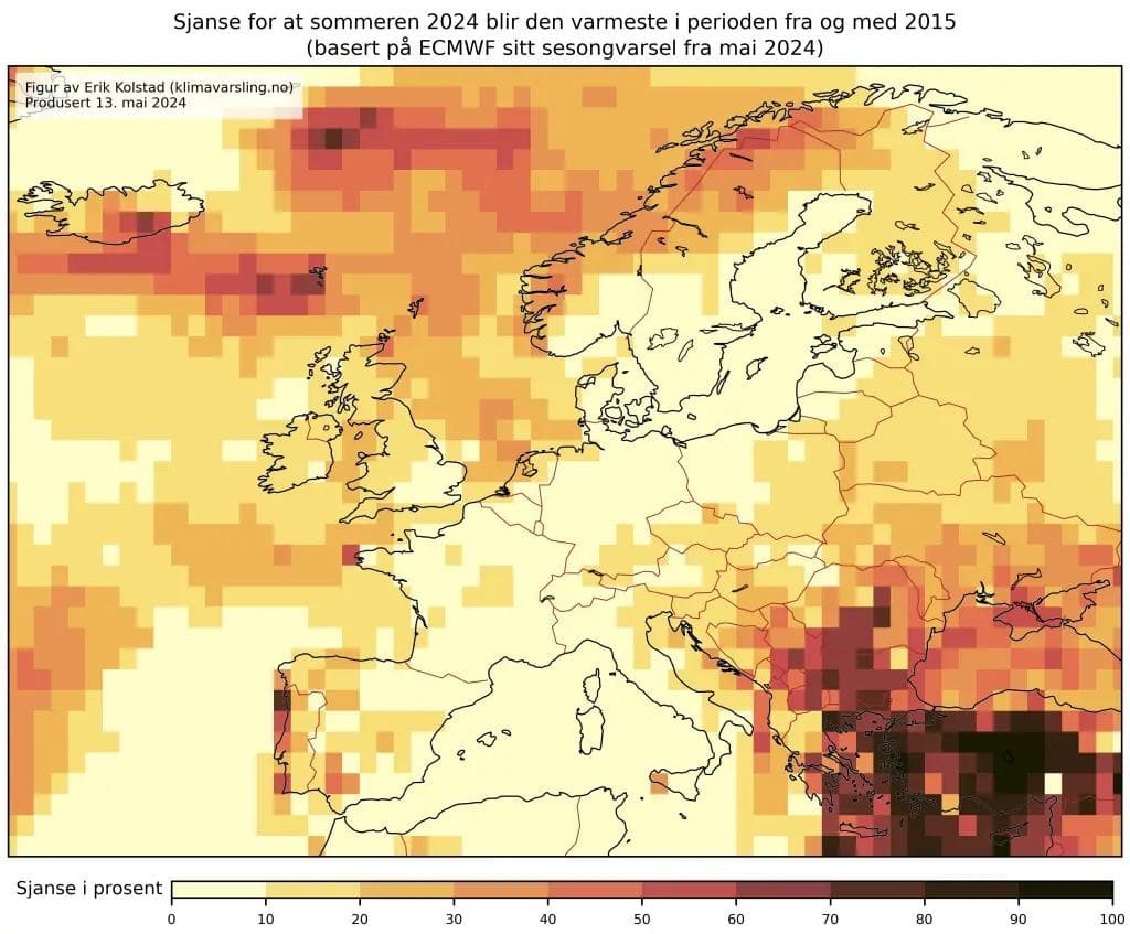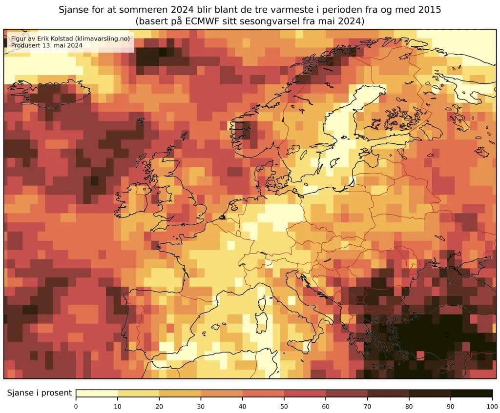 Det gir mer robust statistikk å se på sannsynligheten for at 2024 kommer til å bli blant de tre varmeste i perioden etter 2015. Da gir ikke ekstreme verdier som den varme 2020-sommeren i Midt-Norge så store utslag mer. Vi ser at prognosene gir en ganske høy sjanse for også dette scenarioet (som har en ren statistisk sannsynlighet på 30 prosent) i det meste av landet, og da særlig på Vestlandet og i Nord-Norge.