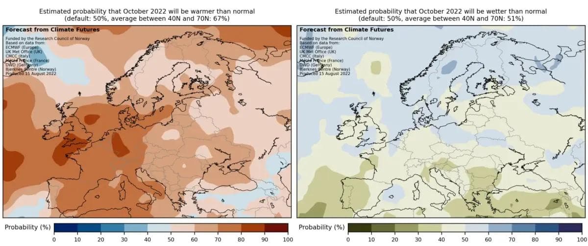 På Kontinentet, og særlig rundt Middelhavet, er sannsynligheten for høyere temperaturer enn normalt mellom 70 og 90 prosent. Dersom det i tillegg blir tørt, vil det forverre den pågående tørken i Europa.