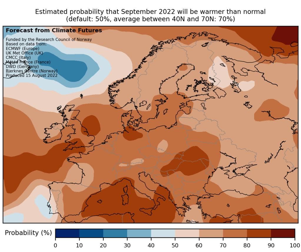 Bildet under viser beregnet sannsynlighet for at september blir varmere enn normalt, der «normalen» er gjennomsnittet for alle septembermåneder mellom 1993 og 2021.