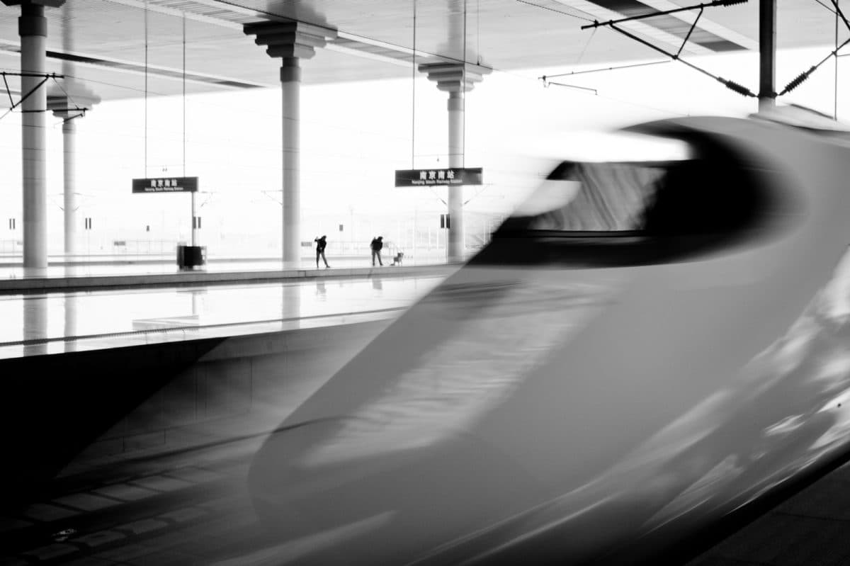 Et høyhastighetstog ruller inn på togstasjonen i Nanjing.
