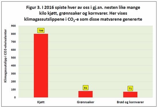 Du og jeg spiste i 2016 i gjennomsnitt ca. 80 kilo kjøtt, 80 kilo grønnsaker og 80 kilo kornprodukter. Men klimagassutslippene disse tre matvaregruppene genererte var svært forskjellige. Kjøttforbruket hadde nesten 10 ganger så høyt klimagassutslipp som grønnsakene, og over 11 ganger så høyt utslipp som kornvarene (se figur til slutt i artikkelen).