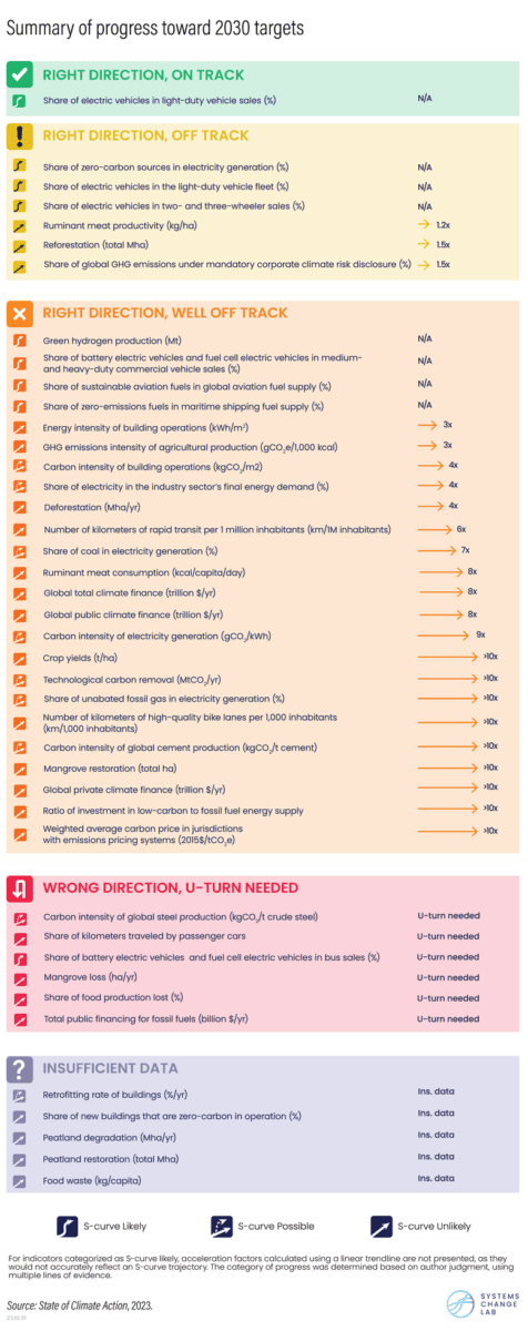 - U-sving: På seks indikatorer går utviklingen i helt feil retning. Eksempler: Reduksjon av karbonintensiteten i stålproduksjon, reduksjon av mat som går tapt i produksjonen, utfasing av subsidier til fossil energi.