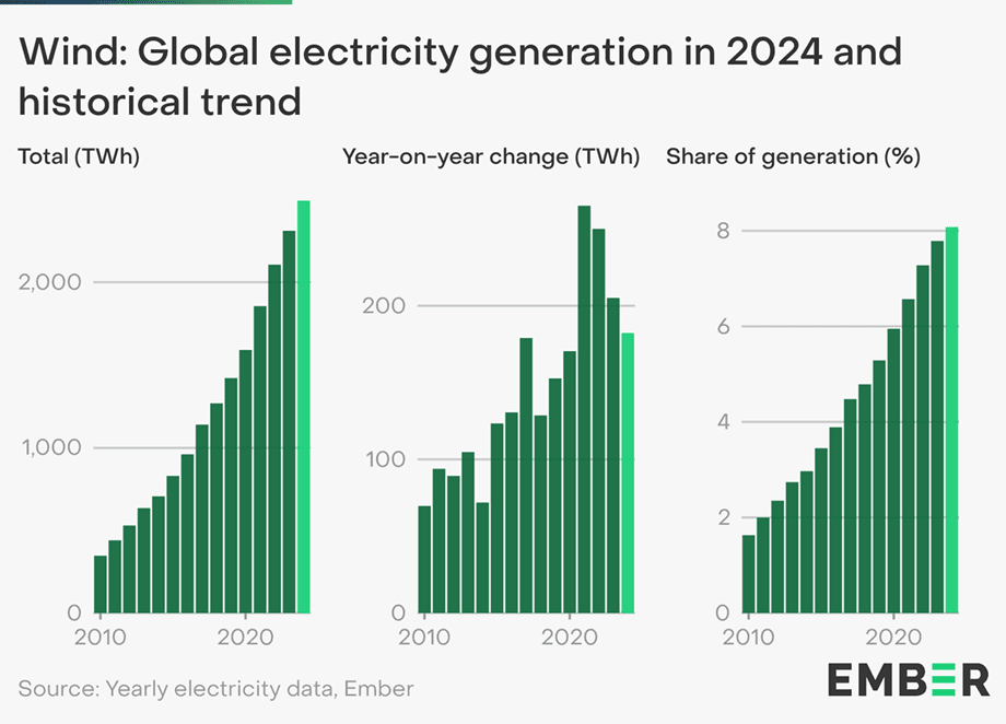 Verdens produksjon av vindkraft satte ny rekord i fjor - opp 7,9 prosent fra 2023 til en totalproduksjon globalt på 2 494 TWh. Dermed nådde vindkraftens andel av den globale strømmiksen 8,1 prosent i fjor, opp fra 7,8 prosent fra 2023.