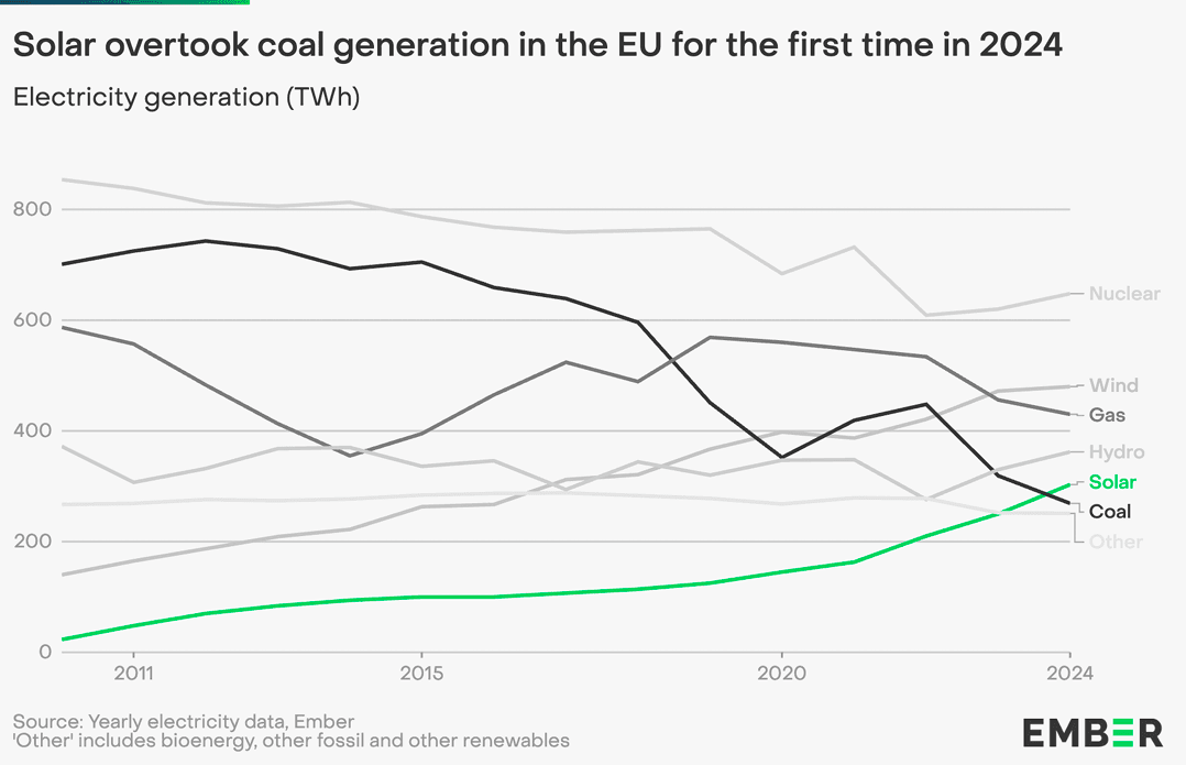Også i EU tok solkraften gode jafs fra kullet, i 2024 ble det for første gang produsert mer solkraft enn kullkraft i EU. Solkraften hadde en økning på 53 TWh sett opp mot 2023, økningen er på hele 21 prosent i løpet av det siste året. Vindkraften steg med 8 prosent.