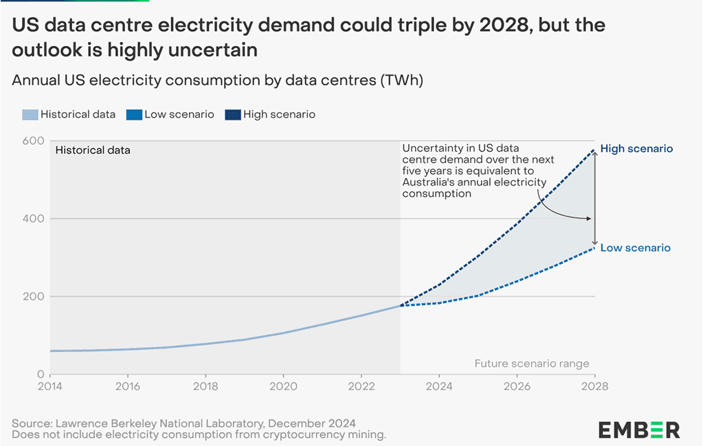 Nylige anslag fra Lawrence Berkeley National Laboratory (LBNL) viser sprik i prognosene for datasentre i USA i spennet 325 til 580 TWh i 2028. I 2023 var behovet 176 TWh. Selve spennet i prognosen for 2028 er så stort at det tilsvarer Australias årlige strømforbruk.