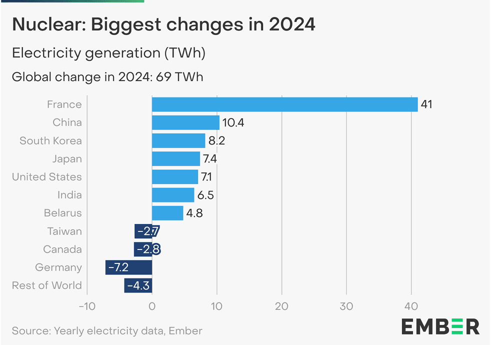 Produksjonen av kjernekraft økte med bare 2,5 prosent i fjor. Kjernekraftens andel av den globale elektrisitetsmiksen falt til sitt laveste nivå på 45 år. Økningen vi så i 2024 skyldtes at produksjonen steg igjen i Frankrike etter utfordringer med korrosjon og mangel på kjølevann under hetebølgene i 2023.