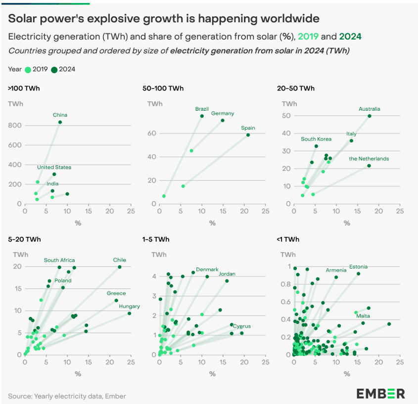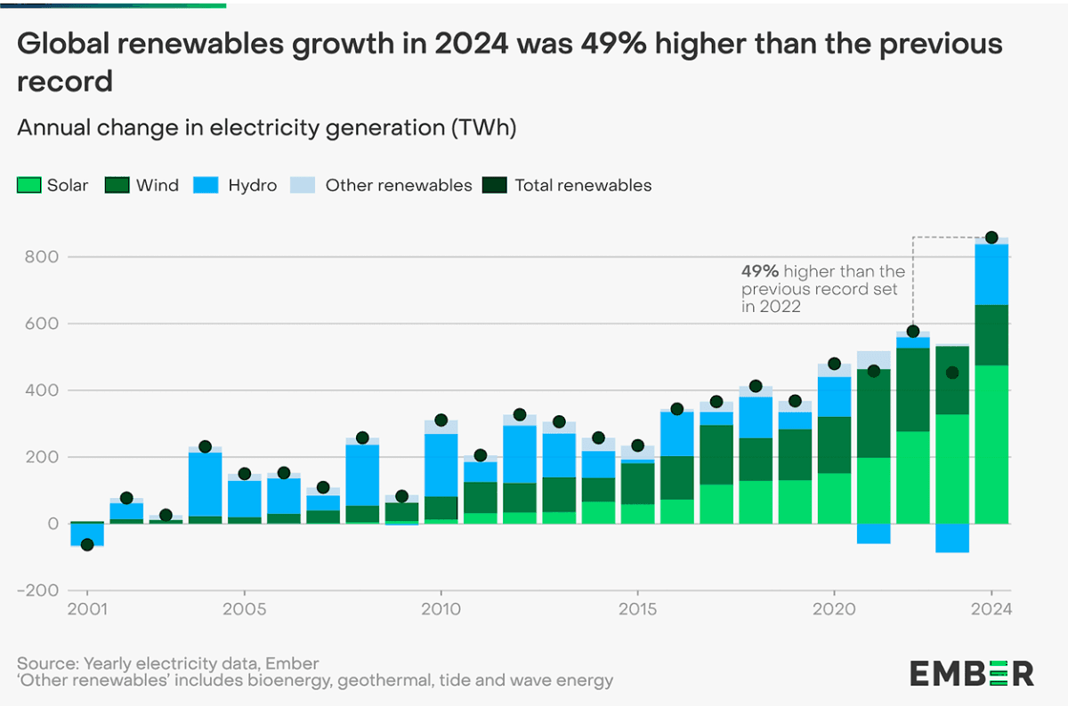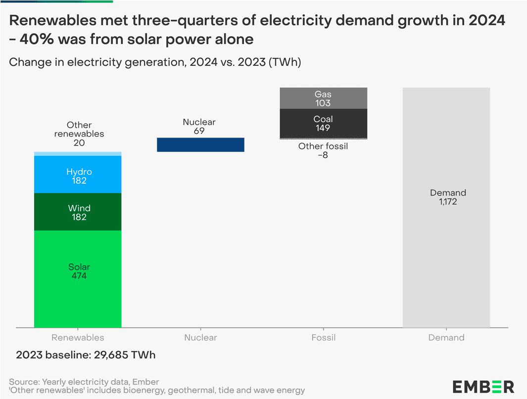 Den gode nyheten er at solenergien vokste mer enn dobbelt så mye som kullet. Kina sto for mer enn halvparten av den globale økningen i vind- og solkraft i 2024.