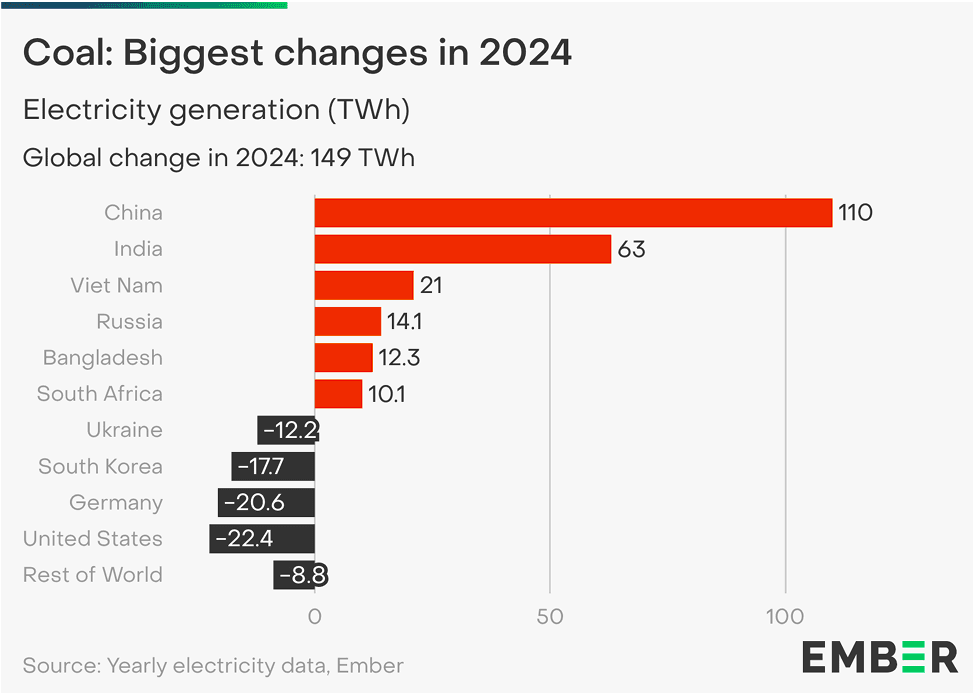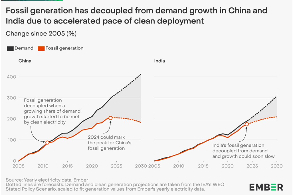 Kina og India har stått for svært mye av verdens økte forbruk av fossil energi. De siste fem årene har den globale årlige produksjonen av strøm basert på fossil energi økt med 1 165 TWh. Hele 95 prosent av denne globale nettoøkningen sto Kina for – det vil si til sammen 1 104 TWh for perioden 2020 til 2024.