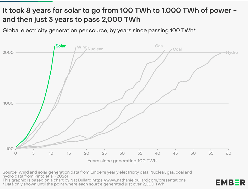 Det tok åtte år for solenergiproduksjonen å gå fra 100 TWh til 1000 TWh, men bare tre år fra 1000 til 2000 TWh. Denne raske veksten i solenergien er en megatrend som allerede sparer verden for store utslipp.