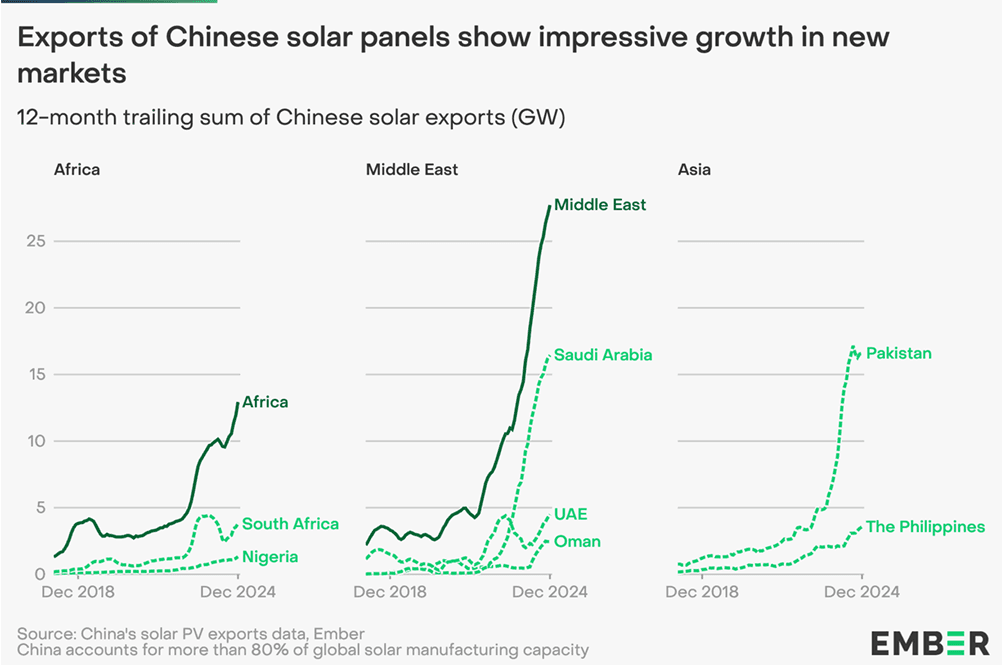 Det er Kina som står for mer enn 80 prosent av produksjonen av det som trengs for å få på plass en solcelleinstallasjon. Data fra Det internasjonale energibyrået - IEA - viser stor eksport av solcellepaneler fra Kina også til andre nye markeder som Midtøsten og Afrika.