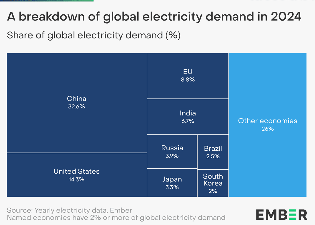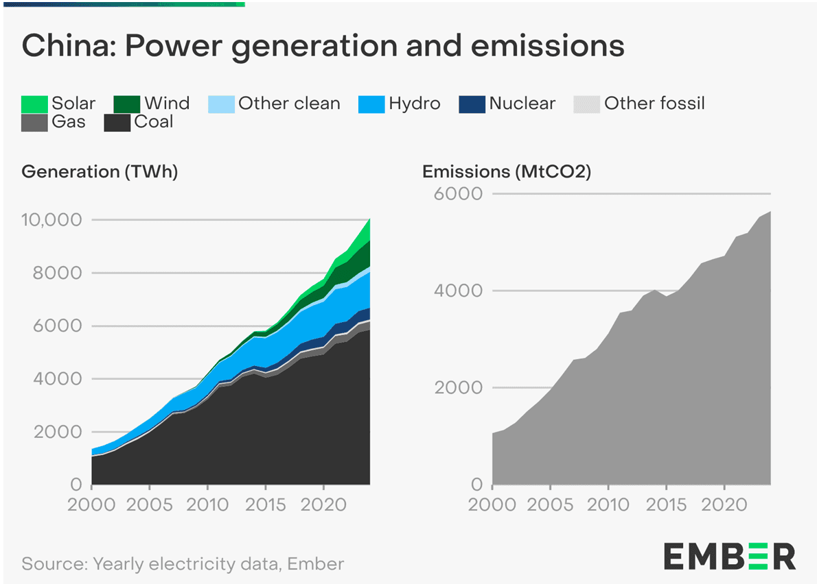 Etterspørselen etter strøm øker og øker i Kina, siden 2000 har behovet sjudoblet seg fra 1 347 TWh til 10 066 TWh i 2024.